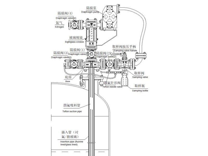 太極反應釜在線自動取樣系統(AUTOMATIC SAMPLING SYSTEM)為防腐在線取樣裝置。取樣物料接觸各部件均采用里襯PFA、襯氟材質,達到防腐目的;四氟吸料管配套插入管(襯氟/搪玻璃材質)浸于釜內料液以下,增加其過程的穩定性。隔膜泵以潔凈壓縮空氣為動力,物料在取樣系統中形成閉環循環回路,過程快捷、安全、無污染。
